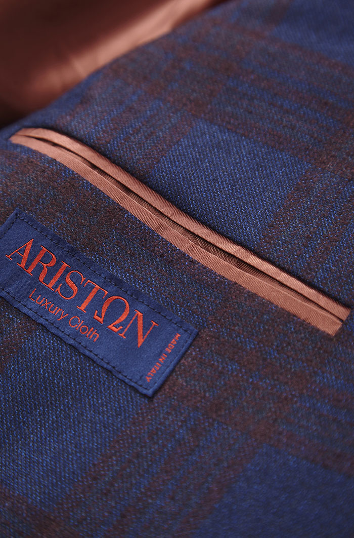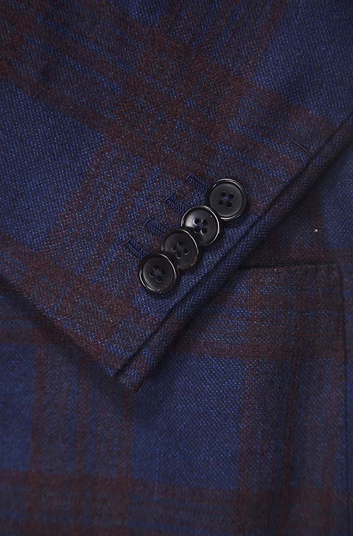 細節:本款西裝深藍的底色交織著酒紅色格紋,溫厚而不顯跋扈,無時無刻不在彰顯著華貴和時尚。94%wool+6%silk,面料柔順而舒適,295gr的克重讓它四季皆宜,它是厚薄適中的最佳狀態,一年四季都可以穿著。