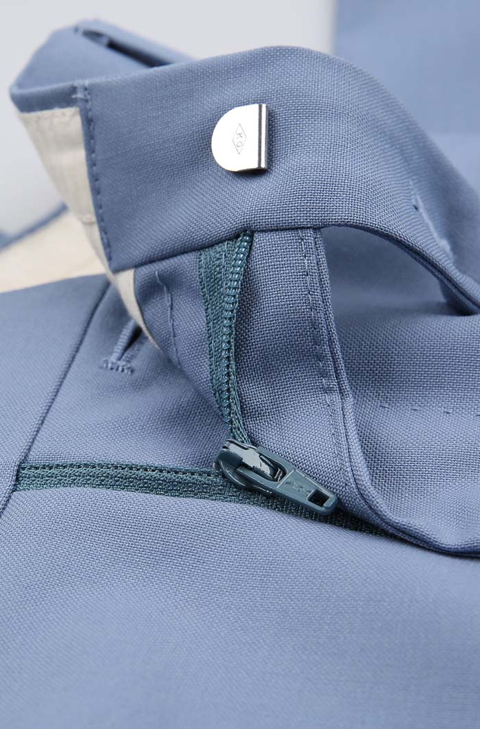 細節:清新的藍灰色有著沁人心脾的爽朗感,它也是一衣多穿的實用款套裝。成套搭配具有正式度,將下裝換成白色褲裝,又是另一番景象。將飽和度不同的深藍與淺藍進行混搭,有輕有重、層次分明,它會帶給你更多新鮮感。