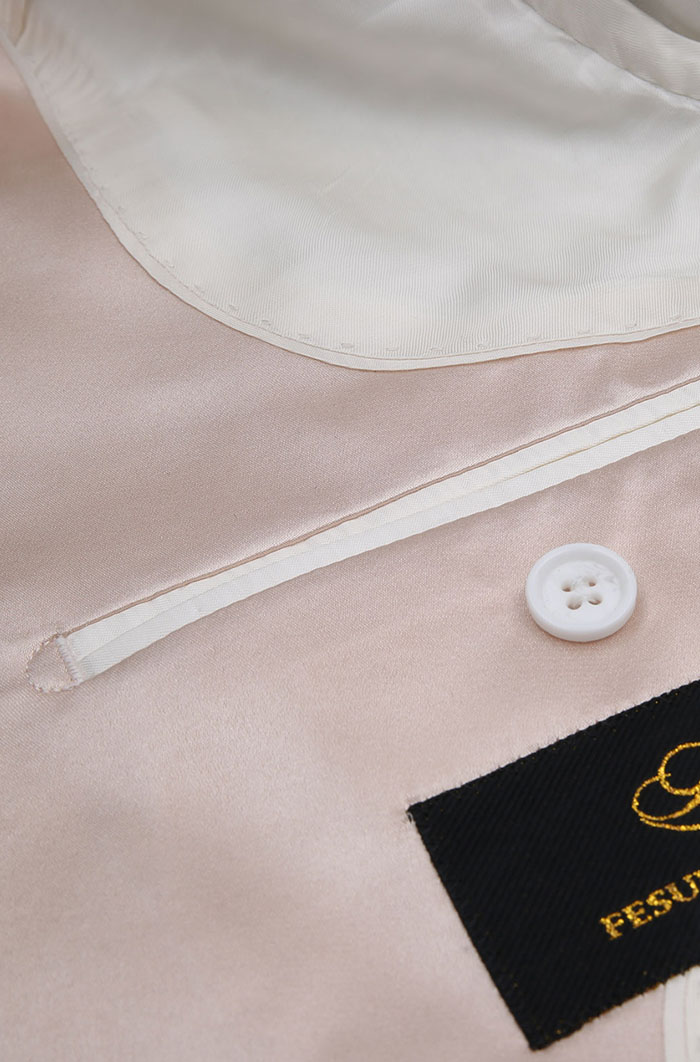 細節:本款香檳色禮服套裝沿用經典塔士多禮服配飾,搭配緞面駁領,使套裝更具尊貴感。它既有經典塔士多禮服的儀式感,也有香檳色禮服的高貴大氣,氣場不凡。